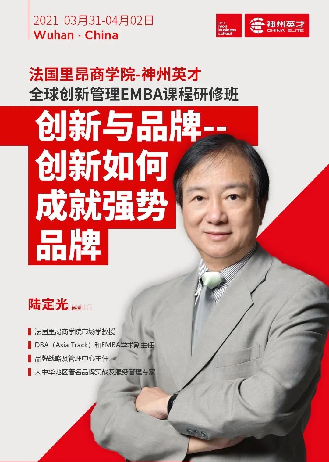 4月1日-2日為期兩天的課程,將由法國里昂商學(xué)院市場(chǎng)學(xué)教授,DBA(Asia Track)和EMBA學(xué)術(shù)副主任,品牌戰(zhàn)略及管理中心主任,大中華地區(qū)著名品牌實(shí)戰(zhàn)及服務(wù)管理專家陸定光教授主講,《創(chuàng)新與品牌—?jiǎng)?chuàng)新如何成就強(qiáng)勢(shì)品牌》。